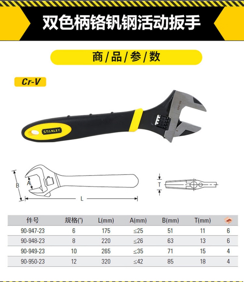 史丹利双色柄铬钒钢活动扳手